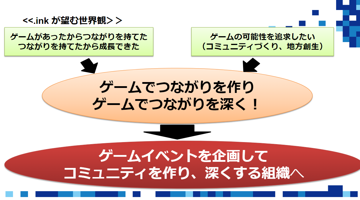 .inkはゲームで人のつながりを創造し、ゲームで人のつながりを深くしていくことが目的の組織です。この私たちが感じた感動を参加者や運営である我々も楽しみながら人に伝えていければと考えています。