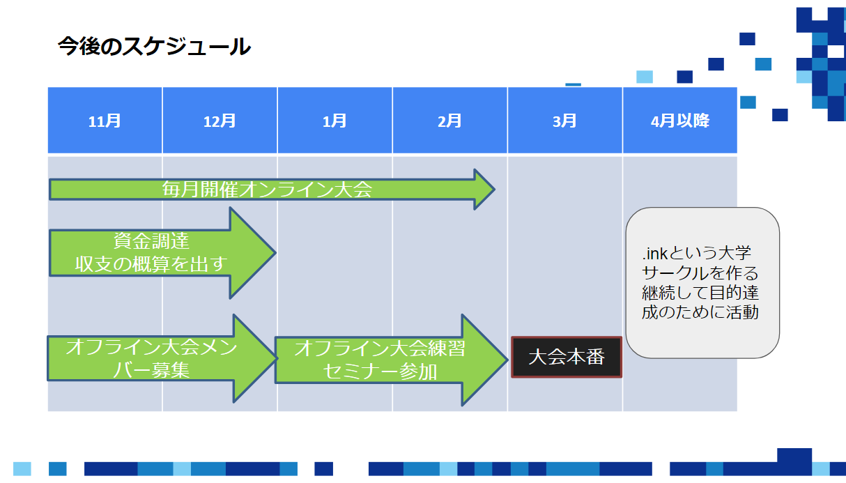 11月大会では8チームが参加し、参加チーム全員が大会を通してチームの仲が深まったと言ってくれたため、.inkのゲームで人のつながりを深くすることが達成できたと感じます。なぜ、それが達成できたのか、運営をする上での実務的な反省点などを今行っている12月大会、オフライン大会につなげていきます。