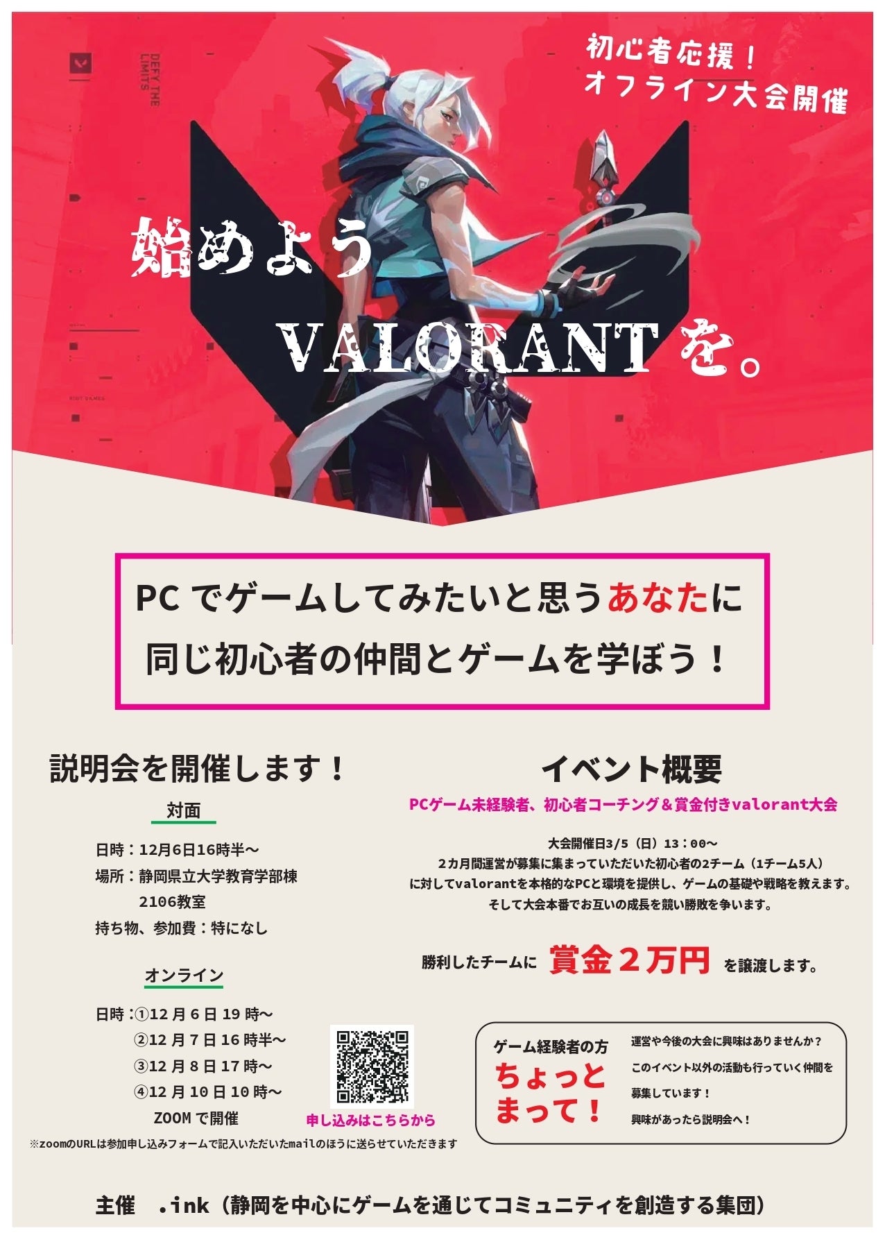 ゲーム初心者、未経験者を対象にしたvalorant(Riot games が運営する5 vs 5 のFPSゲーム。PCを使ってプレイし、アジアで200万人がプレイするゲーム)の大会を開催します。