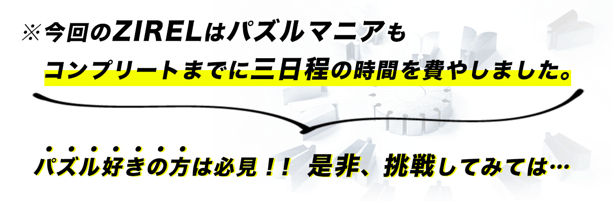 『何よりもまずシンプルかつおもしろい。遊び方を知るのに、時間をかける必要もない。ただ完成までの道のりは長丁場。シンプルでありながら、イライラしたり、興奮したり、切迫感も爽快感も味わえたり、何でもある。競い合って勝者が決まる。だから面白くて重要なことだ』ZIRELが2つあれば、家族、仲間同士、恋人同士スピードを争って罰ゲームありの飲み会も盛り上がるかもしれませんね(笑)