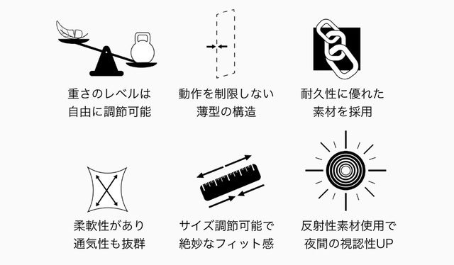 腕立て伏せやスクワットなど、自重で行うものに適していて、トレーニングに合わせた適切な重さのウエイトベスをを着ることで、運動効率をUP。