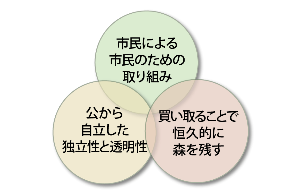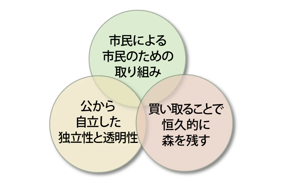 公立・公営の組織ではありません。私たち自身が現地に足を運び、地権者の方と交渉し契約する。土地取得後は自然環境の調査をおこない、管理方針を定め、維持管理していく。自ら考え、決め、行動しています。もちろん今も、ボランティアさんとともに森に入り、維持にあたっています。