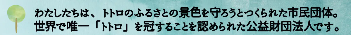 わたしたち公益財団法人トトロのふるさと基金は、1990年4月に発足しました。「トトロ」を冠することに宮崎駿監督・スタジオジブリから承諾を得ている世界で唯一の団体でもあります。