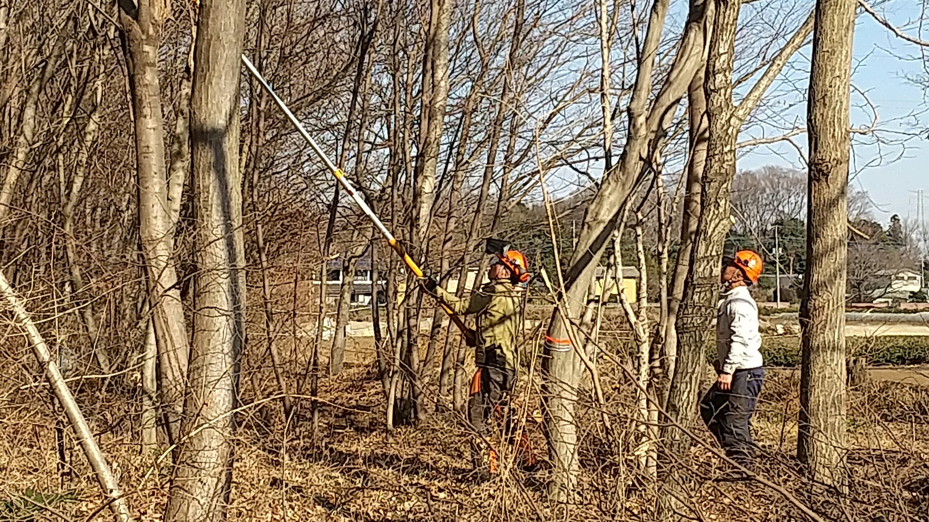 若い木の多い明るい森なのですが、かねてよりお隣の畑への越境木が問題となっていました。樹高が高く、直径も大きくなってしまっていたため事務局部隊が伐採を担当。地域の有志の方たちも伐採枝の片付けのお手伝いに駆けつけてくださいました。