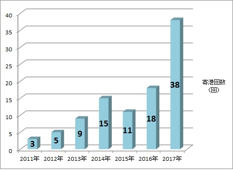 クルーズ船寄港回数増加にともなう清水港の活性化は、県内でも注目されています。ここ数年の寄港回数はグラフの通り顕著な伸びを見せています。2020年にはクルーズ船による訪日外国人の観光客500万人が目標となっていて、清水港も大きな期待が寄せられています。