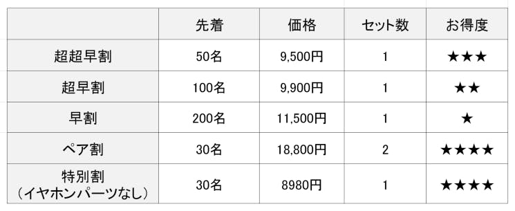 超超早割、超早割、早割の単品と、お得なペアセットをご用意しました。 更に今回はお手頃なイヤホンパーツなしの3WAYで使用できる特別割も登場!!