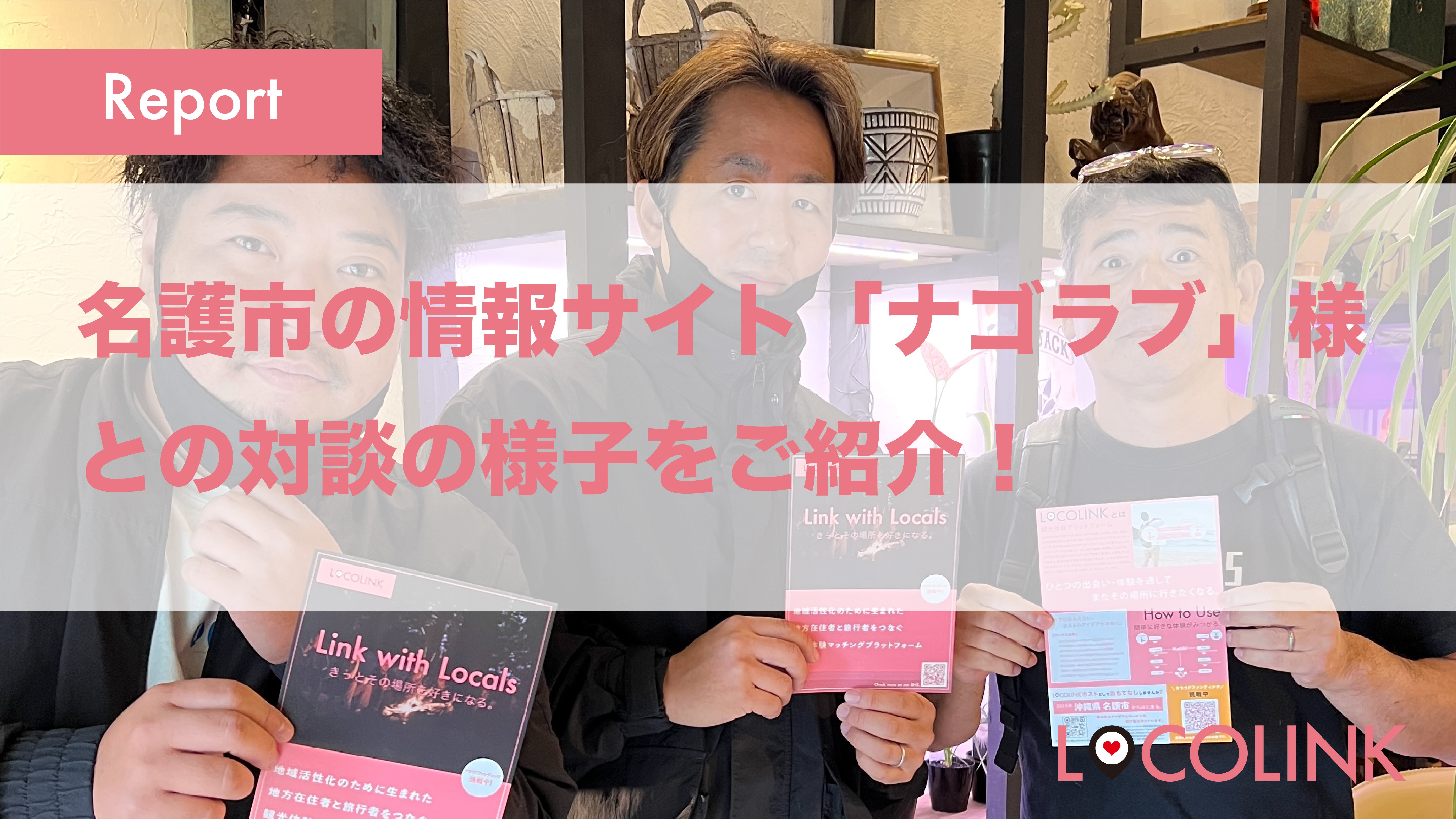 名護市の情報サイト<ナゴラブ>様と対談が実現!2022年12月19日(月)に名護市の観葉植物店Green Jack様のお打ち合わせスペースをお借りし、名護市の情報サイト<ナゴラブ>を運営する一般社団法人やんばるナゴラブ様との対談を実施しました。ナゴラブ代表理事 渡具知 豊氏、理事 屋部 憲史朗氏をお招きし、LOCOLINK代表の山田 剛、LOCOLINK沖縄チームリーダーの大城 仙一郎の合計4名でディスカッションをさせて頂きました!※右から一般社団法人やんばるナゴラブ代表理事:渡具知 豊氏 中央が一般社団法人やんばるナゴラブ理事:屋部 憲史朗氏 左がLOCOLINK沖縄チーム・リーダー:大城 仙一郎とても有意義なディスカッションとなりました。代表理事の渡具知様、理事の屋部様のご両名にLOCOLINKの想いや考え方をお聞き頂き、素晴らしいご意見の数々を頂戴いたしました。特に今後課題となるホスト集めの方法について相談。「サービス主体ではなく、名護の<人>に価値があるはず。そこに主眼を置いたプラットフォーム展開をすべきではないか。」ととても聡明なご意見を頂きました。わたしたちLOCOLINKのアツい想いもしっかり受け止めて頂いた上でLOCOLINKがうまく進むよう助言をいただけた形です。ナゴラブ様のご期待を裏切らないよう、頂いたご指摘をしっかり受け止め今後も活動を続けたいと思います。渡具知様、屋部様ありがとうございました。ナゴラブについてナゴラブ様は名護市の遊び〜宿泊〜イベント情報〜お買い物まで全ての情報が揃う大人気のメディアです。「名護市の良いところをもっと伝えたい」というアツい想いのこもった素晴らしいサイトです。是非みなさんもチェックしてみてください。※URLはこちら。ナゴラブ