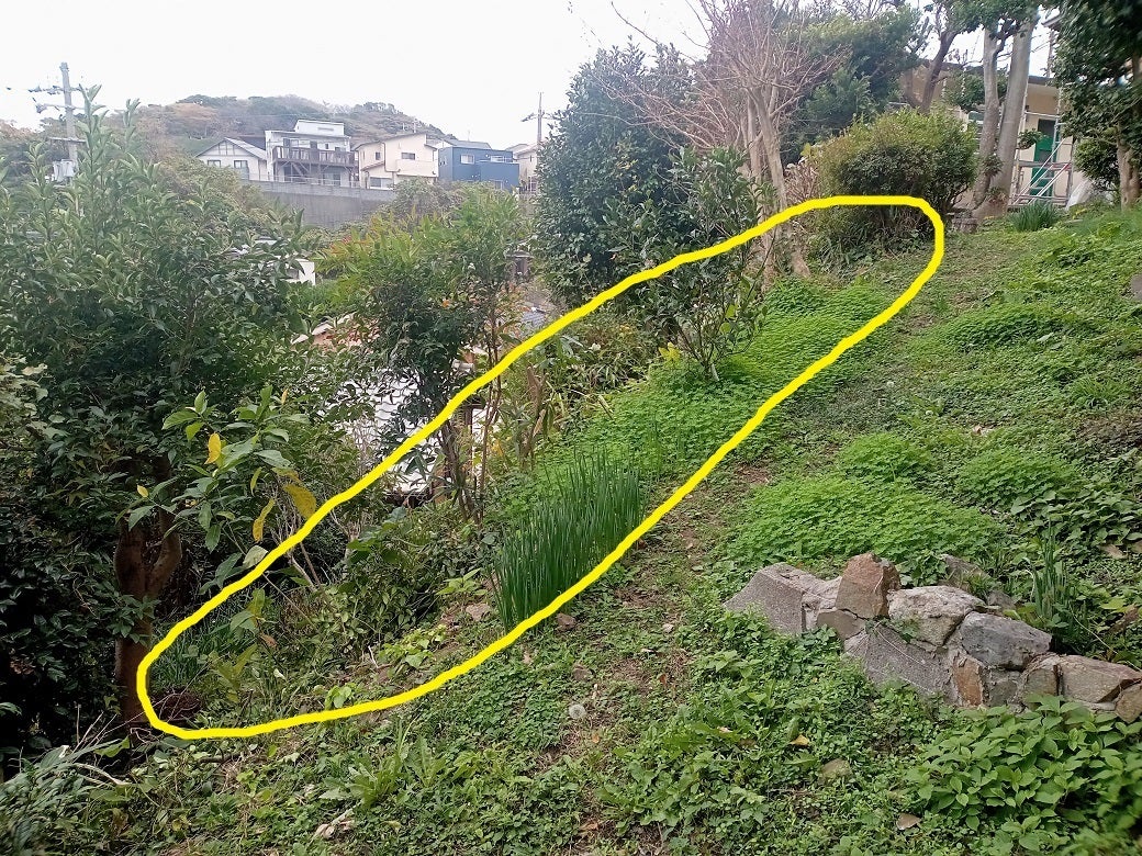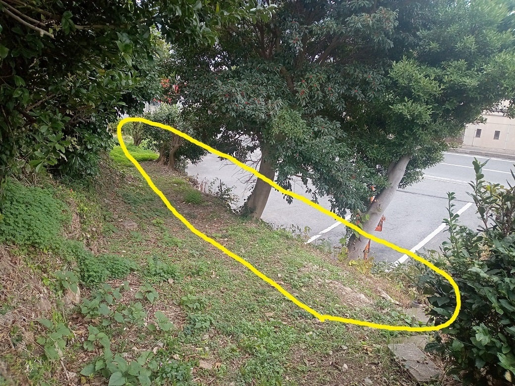なので、黄色の丸のところにブロックを積み、転落防止塀を作ります。