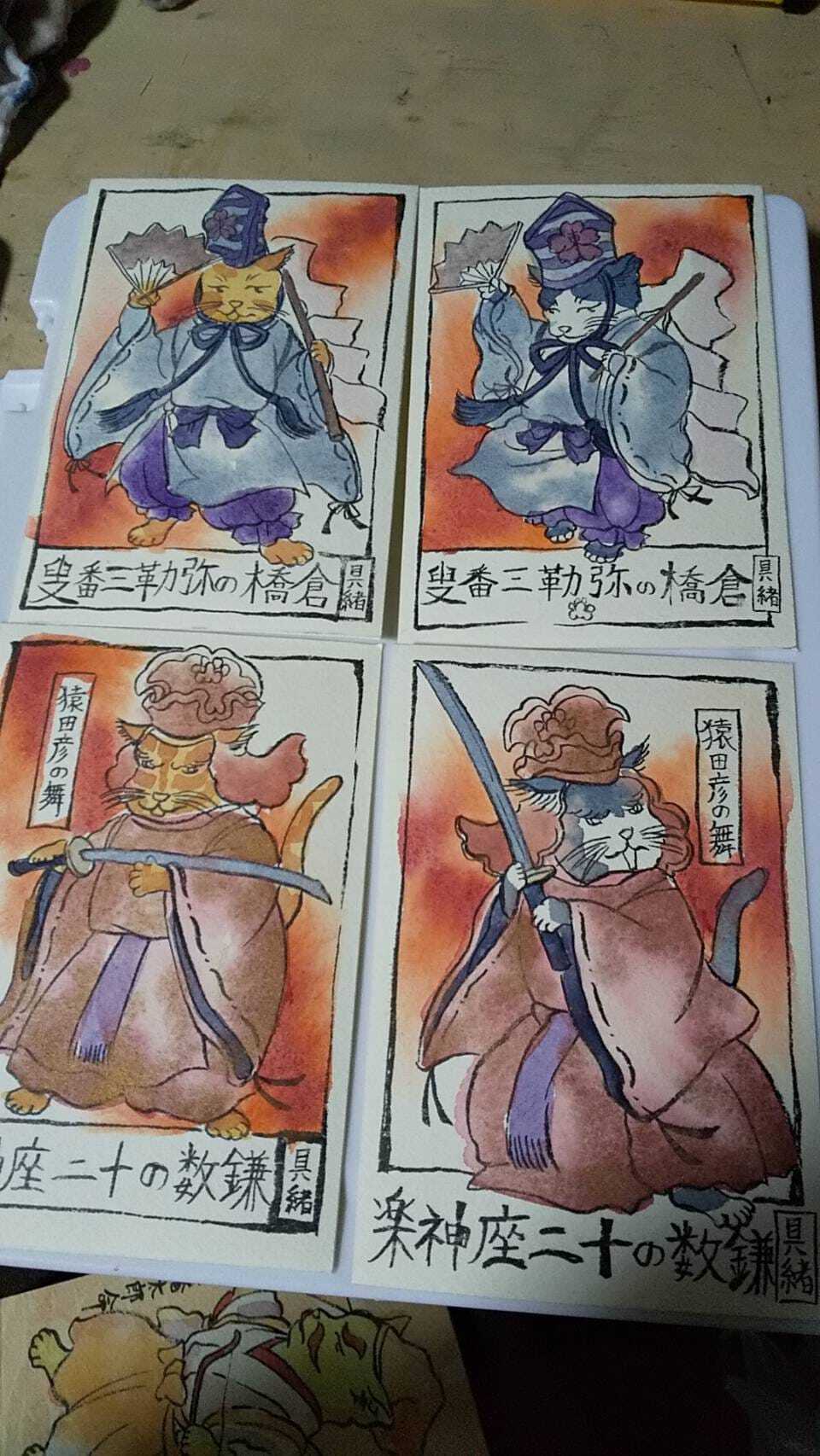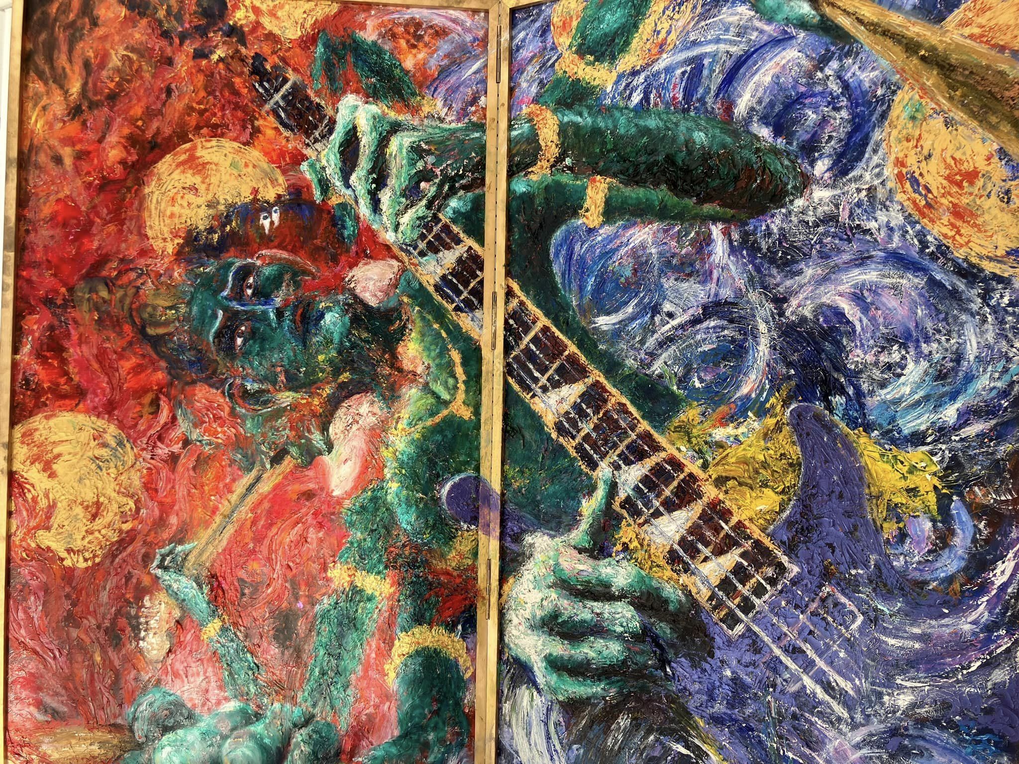 ・神話や宗教のキャラが音楽を奏でる『楽奏神仏シリーズ』を油彩、アクリル板を使ったミクスドメディアで描画する。