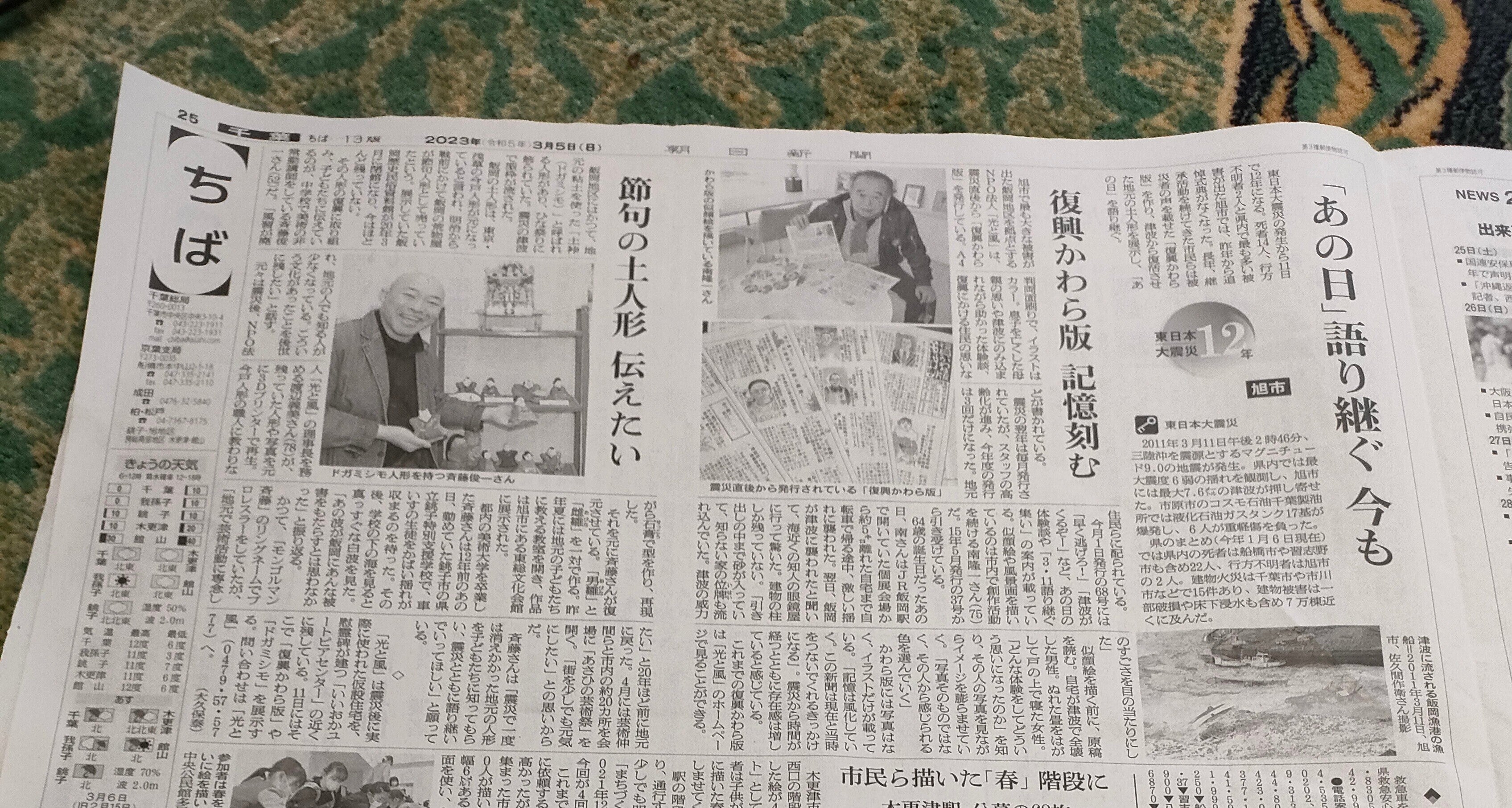あさげーのメンバーは、3・11飯岡津波被害からの復興に携わるものが多いです。今回は、南隆一(「復興かわら版」の挿絵担当)とモンゴルマン(飯岡伝統土人形「ドガミシモ」の保存)が特集されました。11日は「仮設住宅」(飯岡震災遺構)にて、慰霊セレモニーが行われます。そこにはモンゴルマンの「楽奏神仏油絵」が展示され、視覚で鎮魂曲を奏でます。(4月からの芸術祭でも展示します)デジタル版はコチラ↓https://digital.asahi.com/articles/ASR3477GTR2XUDCB00B.html