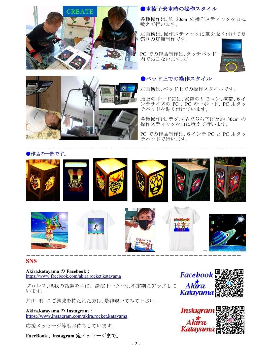1986年21歳で新日本プロレスにてデビューを果たした片山明。ずば抜けた跳躍力を活かしたファイトは多くのファンを魅了しました。ところが1992年の試合で、首から下が麻痺する大怪我をしてしまいます。 片山は地元に帰りリハビリに励む傍ら、口にスティックを咥えてCGを描き始めました。以来30年近く多くの作品を手(口?)掛け、時間をかけて描いた代表作を1点、あさげーに展示することになりました。 作品は(14B)Mado-ka第2展示場、花文字作家まりも と同室に展示されます。