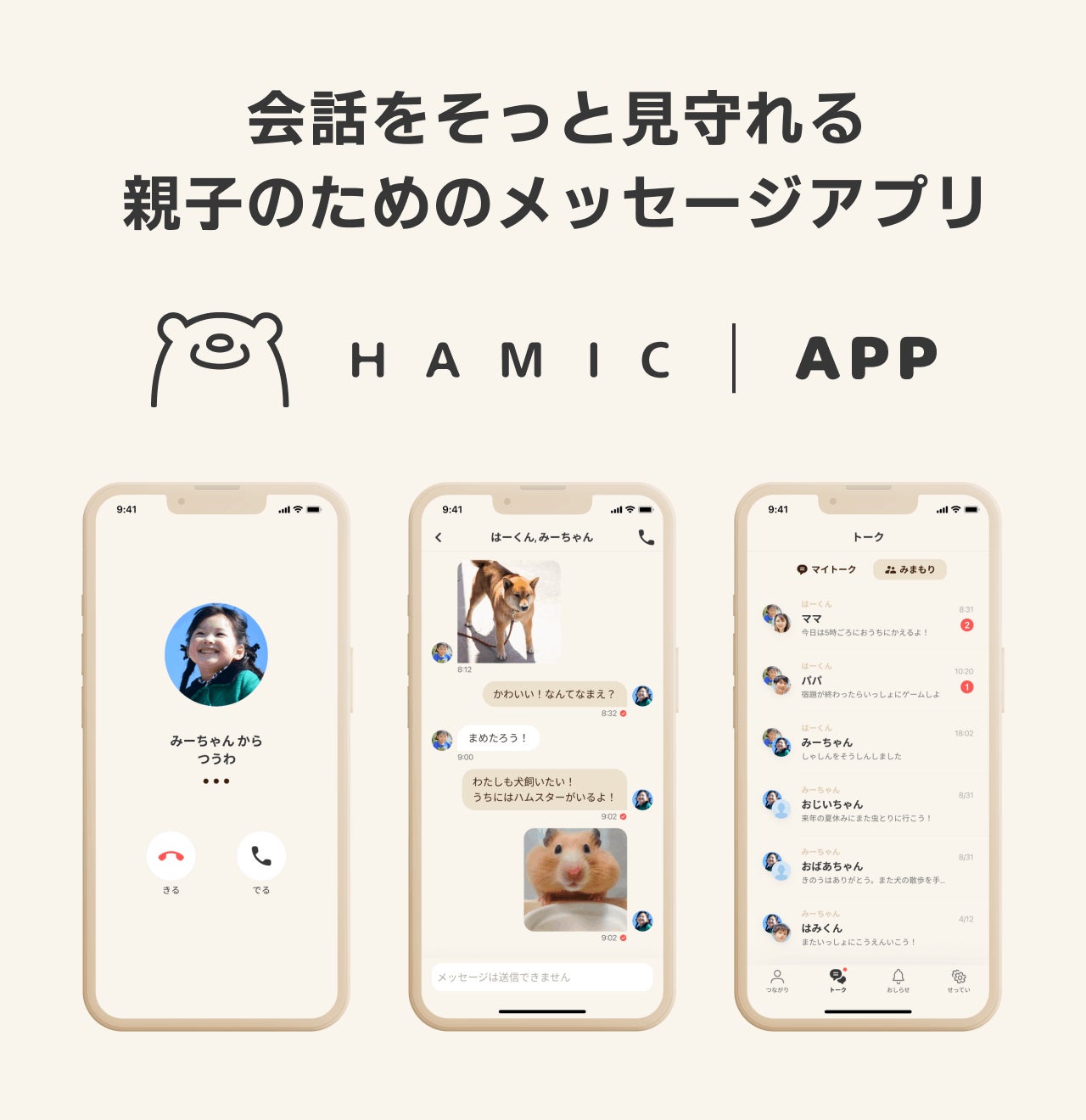 Hamicシリーズのユーザー同士はコミュニケーション用の「Hamicアプリ」を使ってお互いにメッセージのやり取りをすることができ、子ども同士の繋がりを大切にしながら、その様子を保護者が"そっと"見守ることができます。