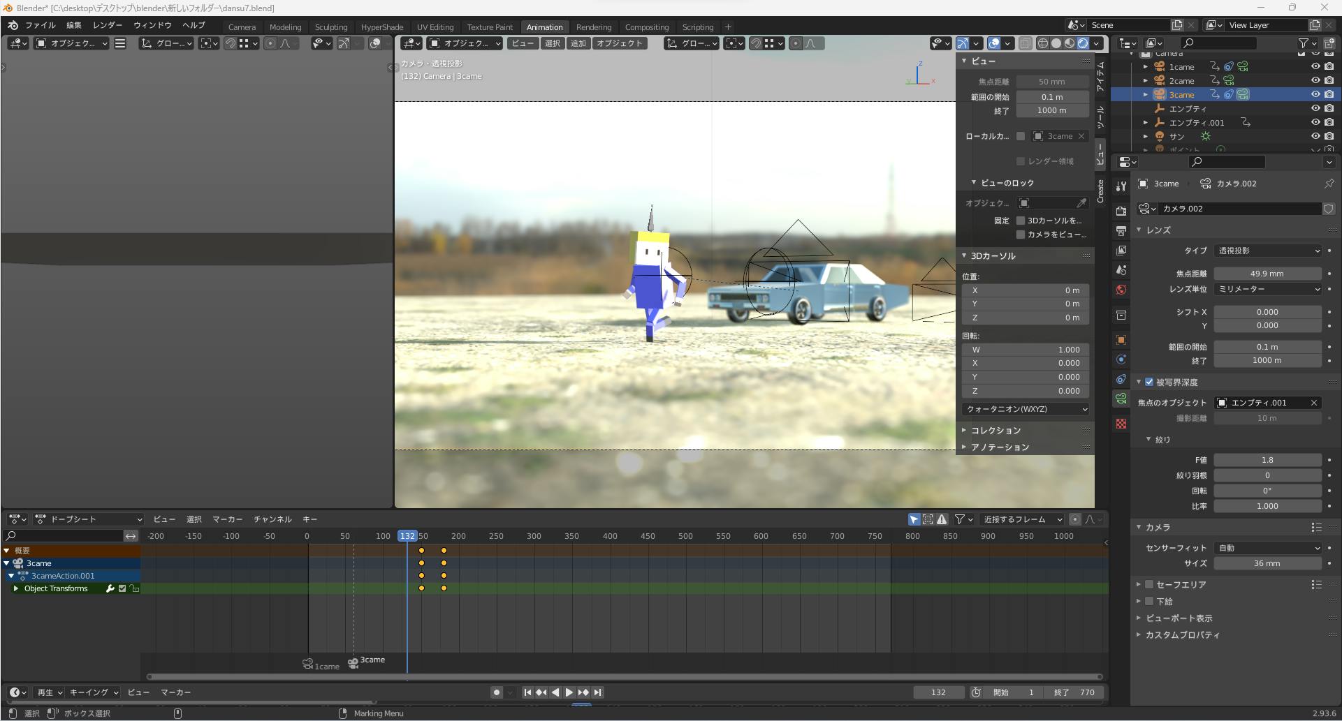 現在はカメラの動きの設定に取り組んでいます。カメラの位置を変えずに撮り続けたり、単純な動きでカメラを動かす映し方でも良いのですが、迫力あるカメラワークにしようと思うと、前回に書いたようなターゲットの設定などが必要です。