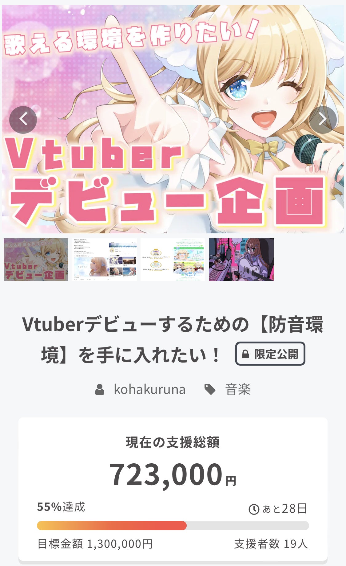 2022/12/23 06:52クラウドファンディング残り1ヶ月になりました!!金額が大きいにも関わらず、たくさんの方が支援してくださったおかげで、50%達成することができました!支援してくださった19名の方々、本当にありがとうございます!!12月Youtube shorts / tiktok毎日投稿してます!新曲の歌ってみたも投稿しているので、是非聞いてください!今年は2023年のデビューに向けての準備期間として1年間配信を頑張ってきました。そして遂に来年Vtuberデビューです。何としてもバズって自分の力で夢を掴み取りたい!1月20日まで全力で駆けます!!よろしくお願いします!! もっと見る