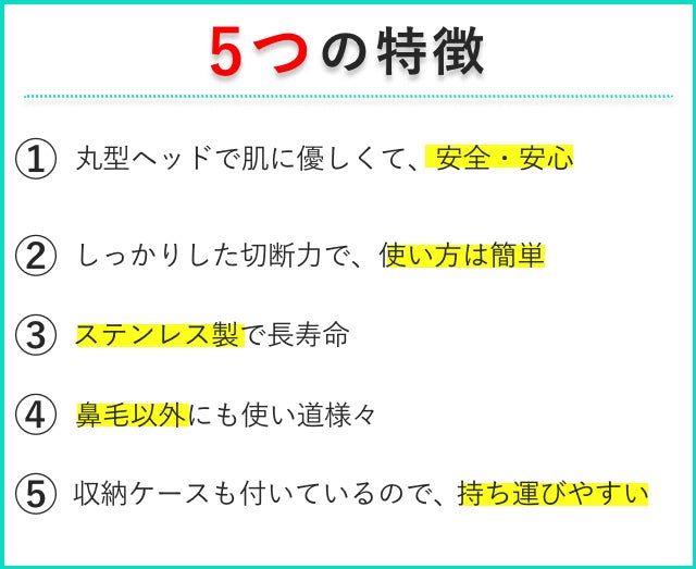 鼻の中に尖ったものを入れるのは怖いですね。鼻毛を安心に切るため、尖った部分がない設計にしました。