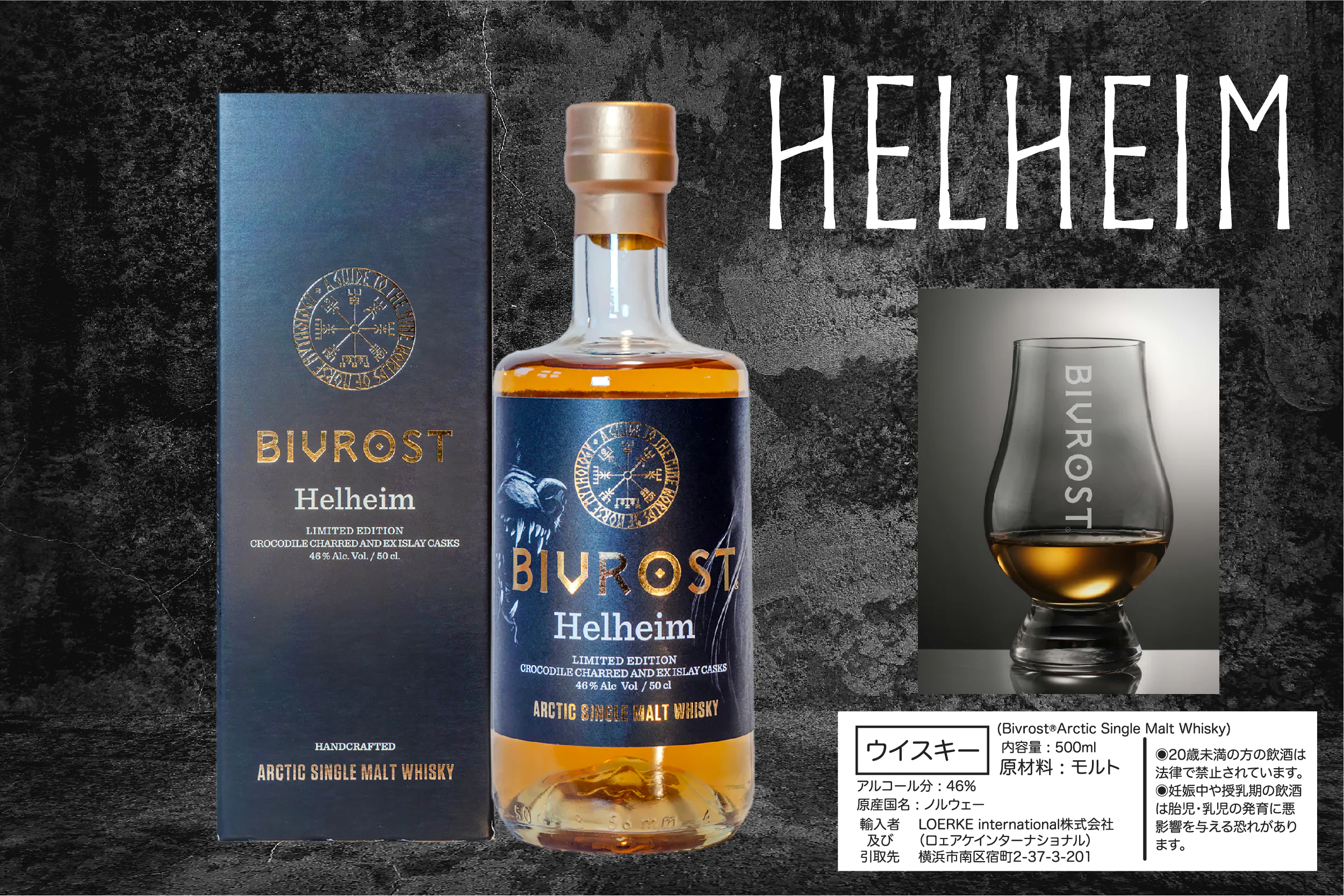 最近リリースされたシリーズ第6番目となる「ヘルハイム」は氷のように冷たい大地、ノルウェーの北極圏で氷河の融解水と北欧の大麦から作られ、ハイテク蒸留器で蒸留された後、厳選されたクロコダイル・チャーのバーボン樽と元アイラ樽で熟成される。バーボン熟成樽の内側を焦がす「チャー」と呼ばれる工程は3段階あり、ライト、ミディアム、そして一番激しく真っ黒にボロボロになるまで焼く焼き方を、焼いた表面がワニのウロコの様に見えることから「クロコダイル」(またはアリゲーター)と呼ばれる。この樽の焼き加減「クロコダイル・チャー」からくる強烈なスモーキーさが、「ヘルハイム」ウイスキーのスパイシーさと上質な葉巻のようなピートの香りをさらに際立たせ、甘くスモーキーな風味を持つ極上シングルモルトウイスキーへと仕上がっている。今回、日本の分としてKING's BARRELが確保した、そんな「ヘルハイム」ウイスキーをぜひ多くの日本のウイスキーファンにもぜひ味わって頂きたい。(本数限定のため、このプロジェクト終了後に当社確保在庫分が残った場合に限り通常販売を致します。)