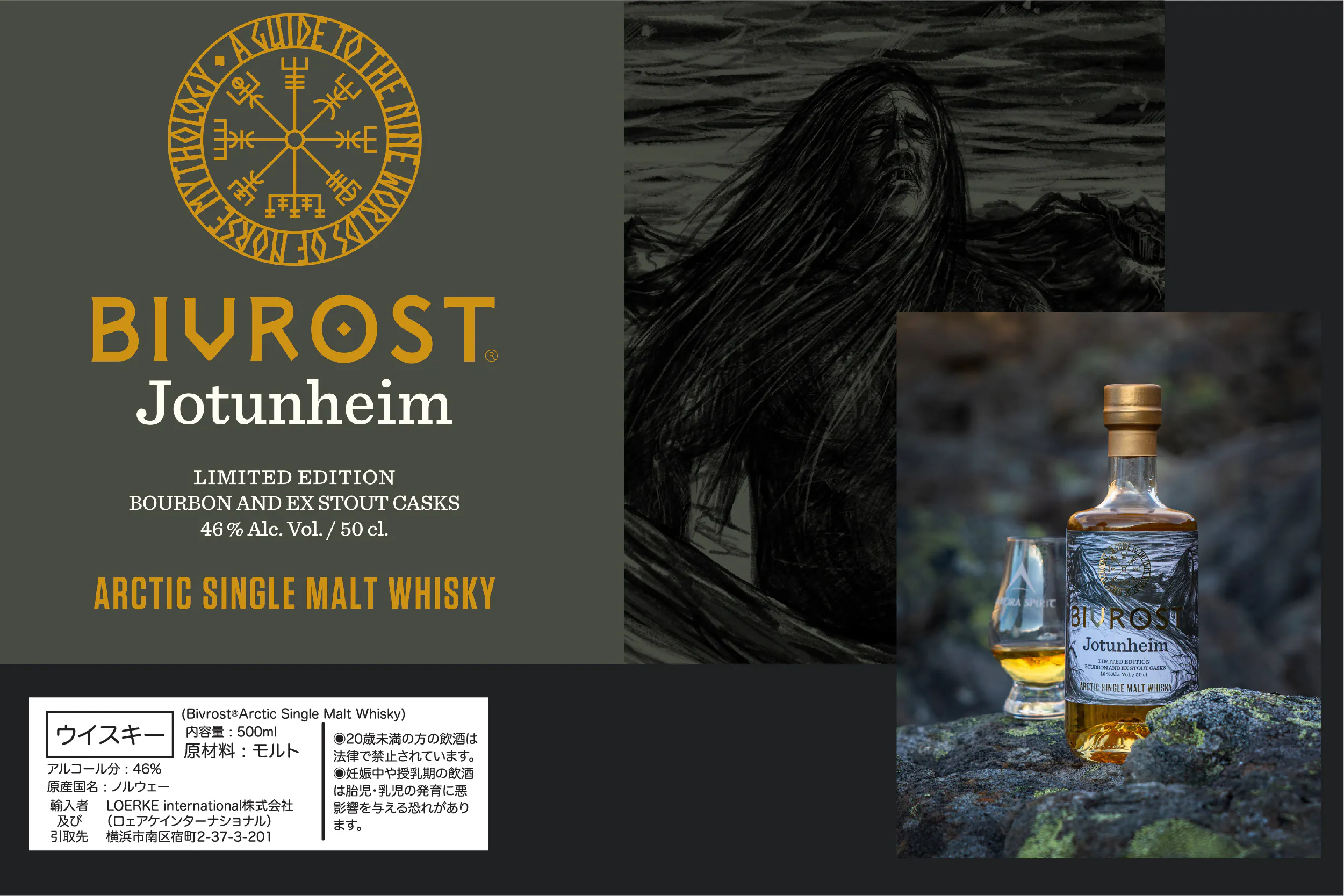 北緯69°のノルウェーの雄大なリンゲンアルプスの麓にあるオーロラの輝きの下で手作りされる、オーロラ・スピリット蒸溜所の「北欧神話の9つの世界」シリーズの4番目のウイスキーであるBIVROST ヨトゥンハイム 北極シングルモルトウイスキー。霜の巨人族と丘の巨人族が住む国「ヨトゥンハイム」をテーマに作られた限定シングルモルトウイスキー。ヨトゥンハイムの巨人たちは神々にとって宿敵であり、神々と巨人たちの戦いの物語は数多くみられる。 大部分が岩、荒野、密林等で構成されるヨトゥンハイムは、海に面した雪に覆われた地域にあるとされる。そんなヨトゥンハイムをイメージしたウイスキーは、北欧の大麦とリンゲンアルプスの氷河の融解水を使用して丁寧に作られ、厳選されたバーボンと元スタウトのビール樽で熟成される。