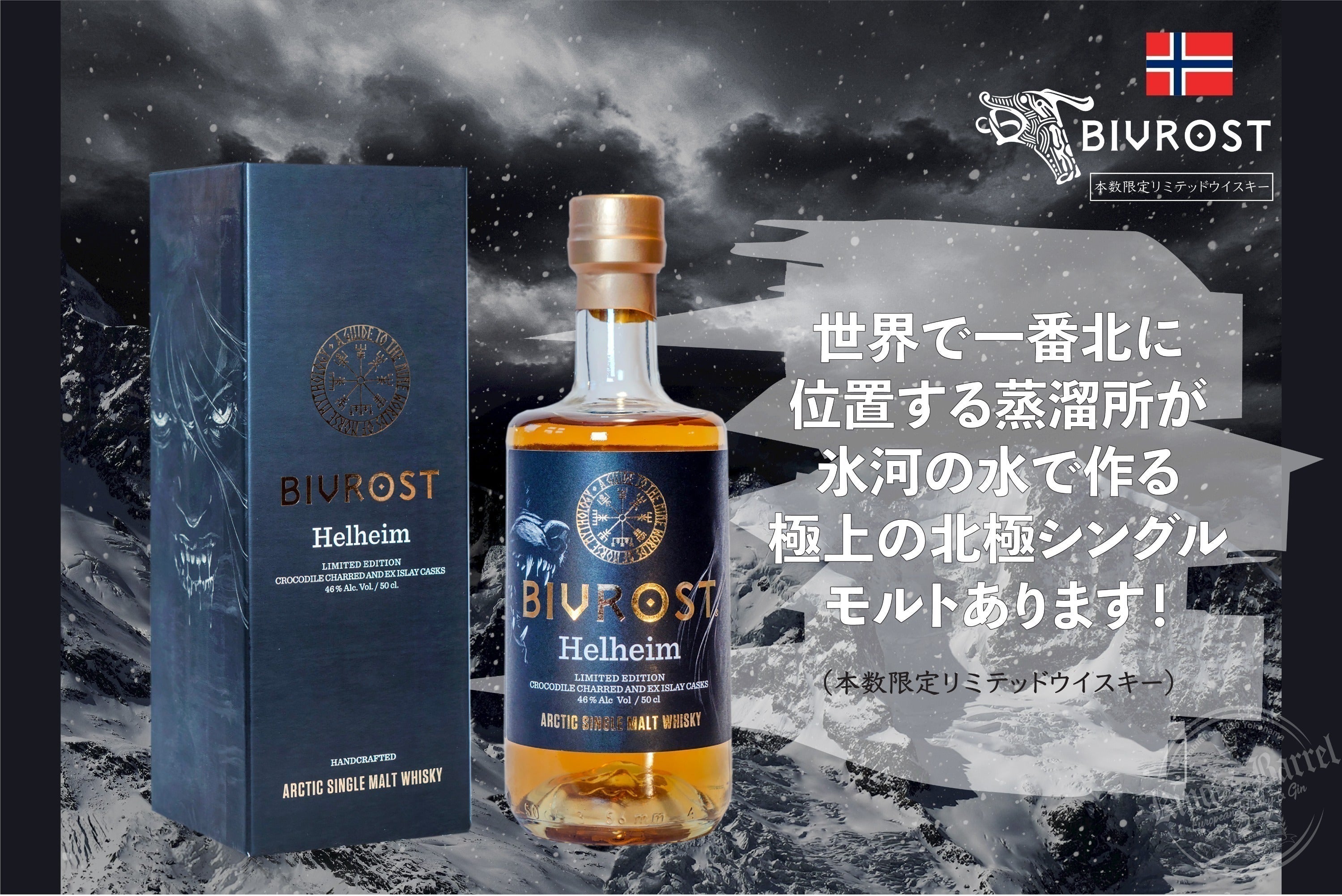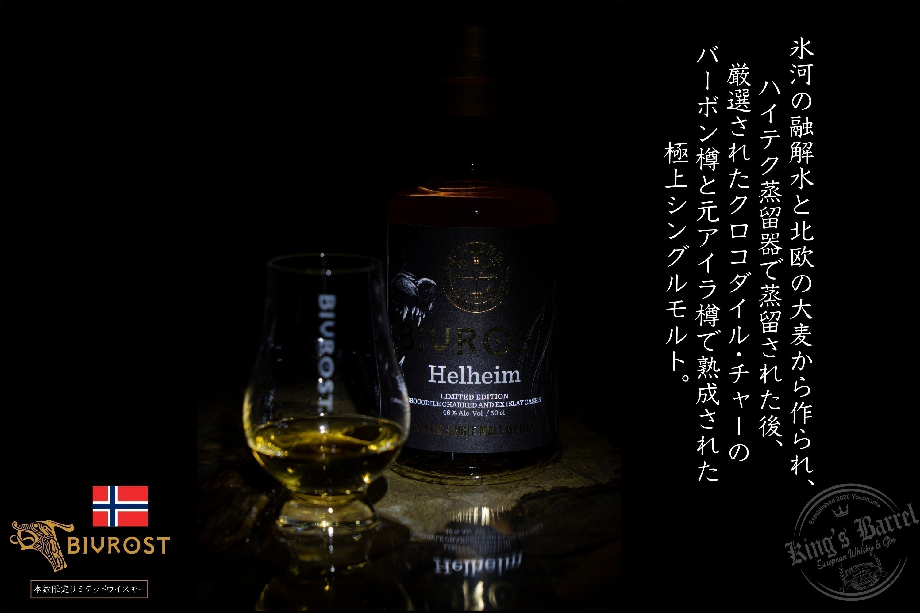 最近リリースされたシリーズ第6番目となる「ヘルハイム」は氷のように冷たい大地、ノルウェーの北極圏で氷河の融解水と北欧の大麦から作られ、ハイテク蒸留器で蒸留された後、厳選されたクロコダイル・チャーのバーボン樽と元アイラ樽で熟成される。バーボン熟成樽の内側を焦がす「チャー」と呼ばれる工程は3段階あり、ライト、ミディアム、そして一番激しく真っ黒にボロボロになるまで焼く焼き方を、焼いた表面がワニのウロコの様に見えることから「クロコダイル」(またはアリゲーター)と呼ばれる。この樽の焼き加減「クロコダイル・チャー」からくる強烈なスモーキーさが、「ヘルハイム」ウイスキーのスパイシーさと上質な葉巻のようなピートの香りをさらに際立たせ、甘くスモーキーな風味を持つ極上シングルモルトウイスキーへと仕上がっている。今回、日本の分としてKING's BARRELが確保した、そんな「ヘルハイム」ウイスキーをぜひ多くの日本のウイスキーファンにもぜひ味わって頂きたい。(本数限定のため、このプロジェクト終了後に当社確保在庫分が残った場合に限り通常販売を致します。)