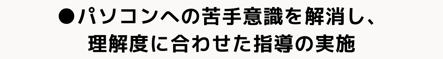 とはいえ、オンライン化が普及しつつある昨今、パソコンは必須スキル。そこで、このスクールでは、個々の理解度に合わせて指導させていただきたいと思っています。