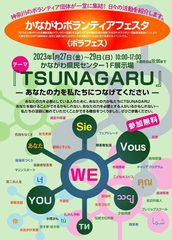 「かながわボランティアフェスタ」は、引きこもりや不登校、吃音症などの当事者へのサポートに取り組む団体から、邦楽器やマリンスポーツ、動物福祉の普及に努める団体まで、神奈川県で活動する多種多様な非営利組織が一堂に会する貴重な機会となっております。詳しくは、かながわボランタリー団体のHPをご参照ください。また会場となるかながわ県民センターは、横浜駅西口からモアーズを過ぎてヨドバシカメラを右に曲がっていただき、西鶴屋橋を渡った先にあります。皆様のご来場を心からお楽しみにしております!