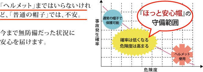 『ほっと安心帽®』は、普段から使える帽子に「安全性」の視点を取り入れた安心・安全のお子さま用帽子です。帽子の機能まそのままに、日常生活での小さな事故から大切な頭を守ることが、不意の災害への 備えにもなります。どうぞご利用下さい。