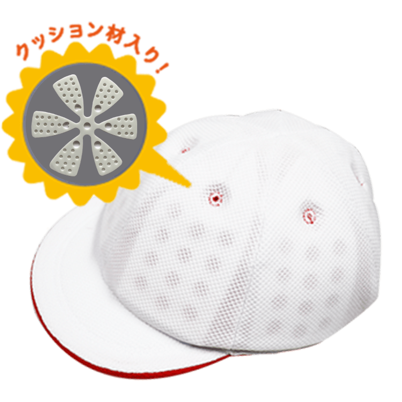 帽子の内側が衝撃を吸収するクッション材入り。国立研究開発法人産業技術総合研究所の試験結果により、一般的な防災頭巾よりもさらに30%以上の衝撃を吸収することが証明されました。やんちゃな子どもたちの見守りに、安心・安全をプラスします。