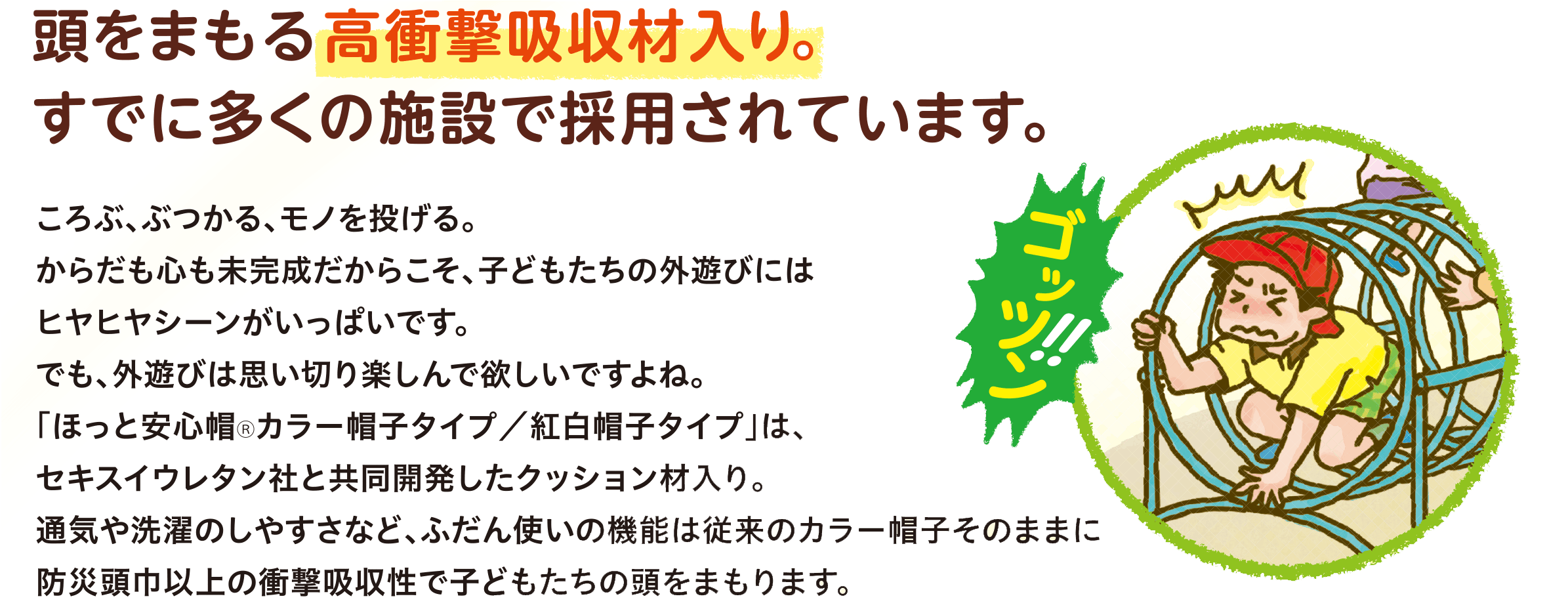 『ほっと安心帽®』カラー帽子タイプは、セキスイウレタン社と共同開発したクッション材入り。通気や洗濯のしやすさなど、普段使いの機能は従来のカラー帽子そのままに、防災頭巾以上の衝撃吸収性で子どもたちの頭を守ります。