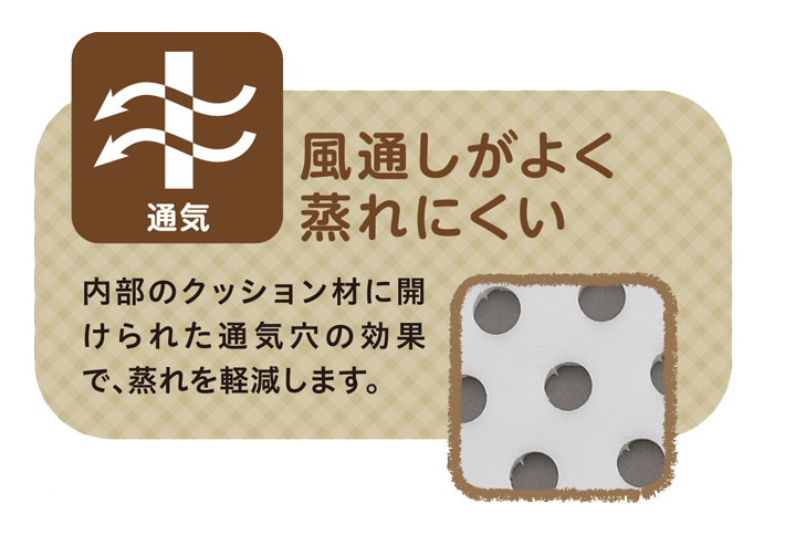 内部のクッション材に開けられた通気穴の効果で蒸れを軽減します。