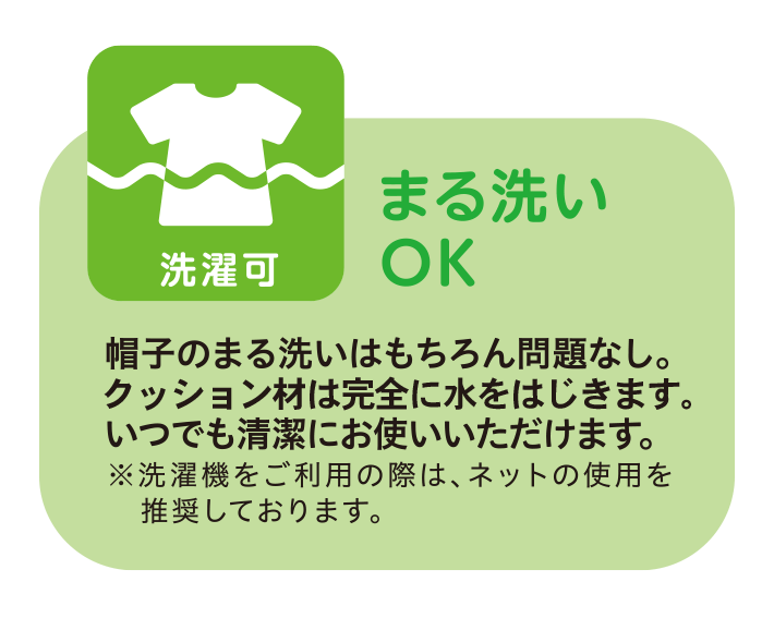 帽子の丸洗いはもちろん問題なし。クッション材は完全に水を弾きます。いつでも清潔にお使いいただけます。