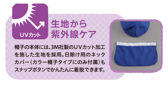 帽子の本体には3M社製のUVカット加工を施した生地を採用。日除け用のネックカバー(カラー防止タイプのみに付属)もスナップボタンで簡単に着脱できます。