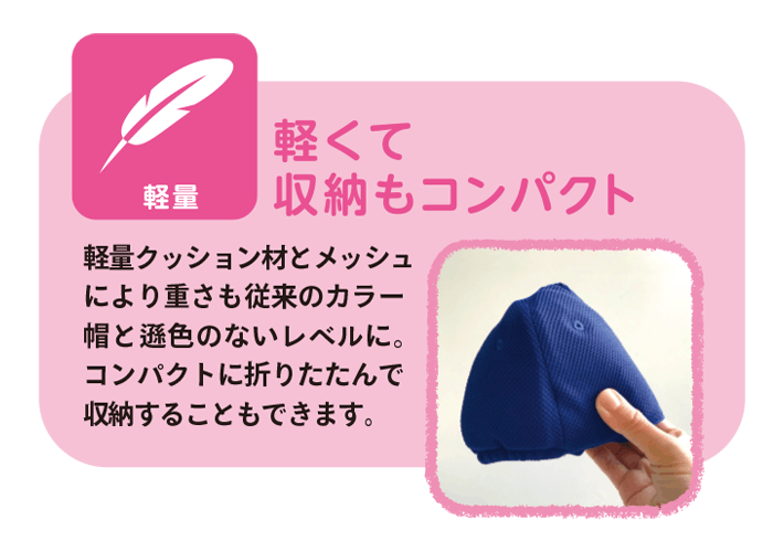 軽量クッション材とメッシュにより重さも従来のカラー帽子と遜色のないレベルに。コンパクトに折り畳んで収納することもできます。
