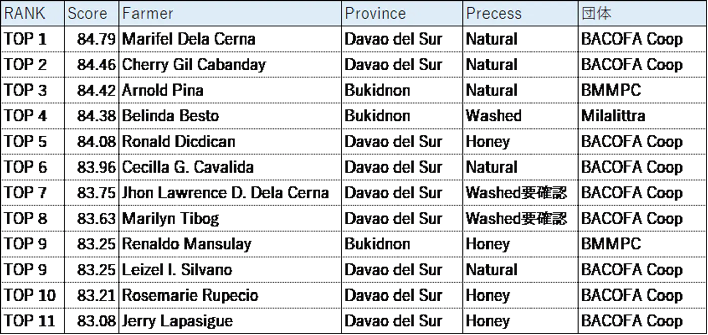 表 2022年フィリピン国コーヒー品評会