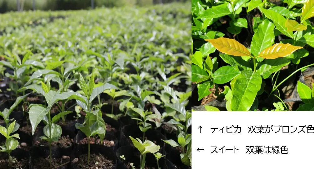 スイートコーヒー(左)とティピカ(右)では双葉の色が異なる。