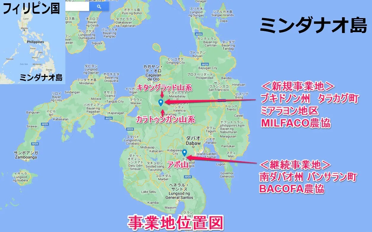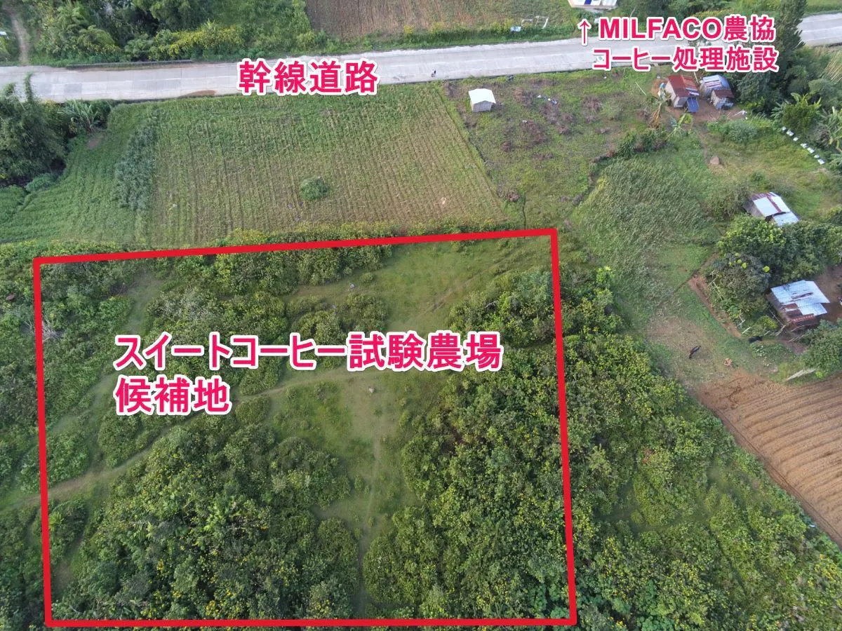 新規事業地(スイートコーヒーの試験農場): ブキドノン州タラカグ町ミアラヨン最小行政区。提携先はMILFACO農協。ダバオ市から北へ210km、車で片道5時間。MILFACO農協(正式名称:Milalittra Farmers Agriculture Cooperative)は少数民族タラアンディグ族の経済部門。キタングラッド山系とカラトゥンガン山系の合間、標高1200~1700mにメンバーの農地があります。