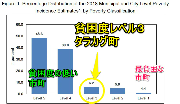 ルソン島に比べてミンダナオ島の方が貧困度合いが高いことが見て取れます。タラカグ町の貧困率はレベル3で、最も貧しい12%に入ります。