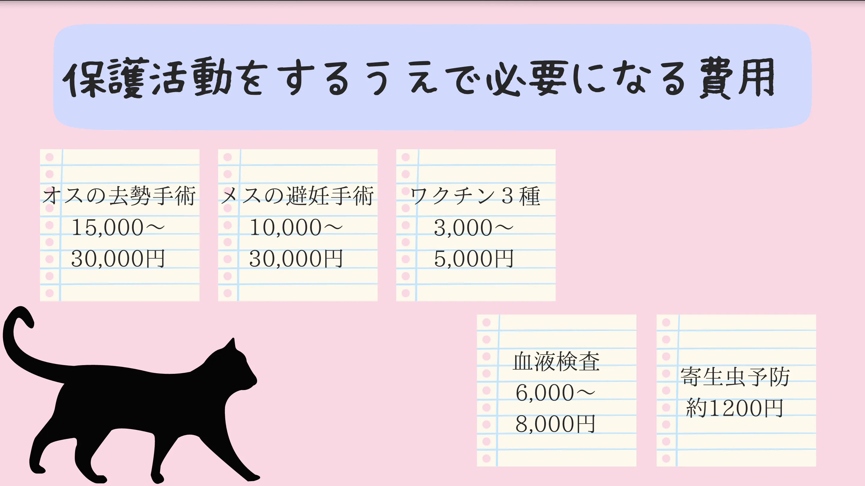 手術にかかる費用は場所によって異なりますが、オスであれば(去勢手術代)15,000 - 30,000円、メス(不妊手術代)であれば10,000 - 30,000円が相場です。このように個人で保護活動をしている保護主さん方にとっては多額な費用がかかります。