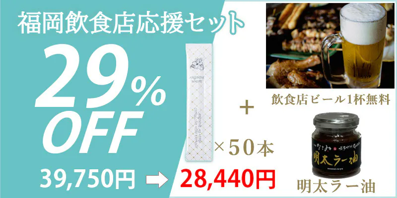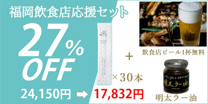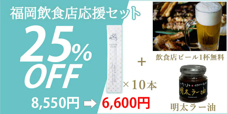 福岡飲食店復興応援企画 アルギニンホワイト10本・20本・30本/明太ラー油/加盟店ビール1杯無料