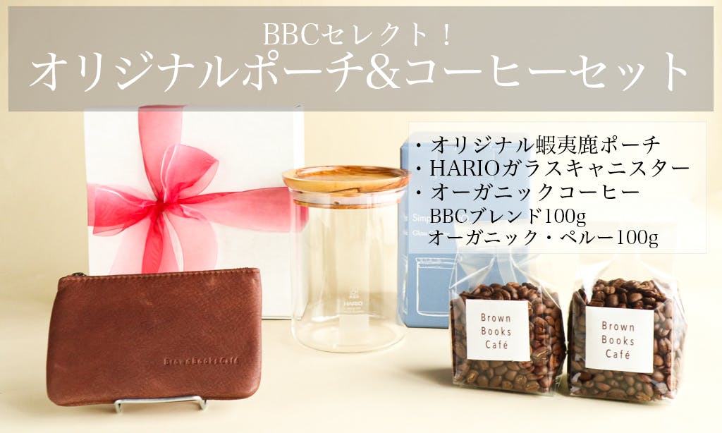 やわらかく手触りの気持ち良い蝦夷鹿の革を使用したオリジナルポーチ(店名ロゴ入り)と、オーガニック・コーヒー豆2種(BBCブレンド、オーガニック・ペルー)100gずつ、そしてこのコーヒー豆を入れるのにぴったりな耐熱ガラスキャニスターのセットです。