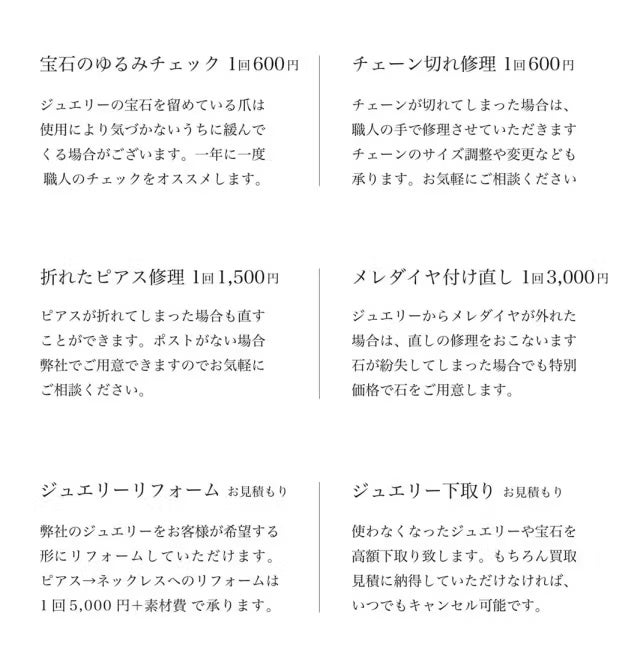 人生で長く身に着ける大切なジュエリーだからこそ 、『購入後』にそのジュエリーやブランドとどう付き合っていくかがとても重要だと考えています。