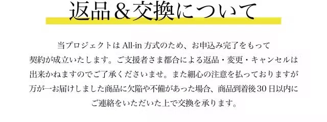 しかしながら開発中の工程において、デザイン・使用が一部変更になる可能性もございます。製造スケジュールについては、プロジェクト成功を想定した数で調整しておりますが、想定を上回る応援の申し込みがあった場合、製造や発送に伴うやむを得ない事情によりお届けが遅れる場合がございます。上記のようにプロジェクトページに記載している内容に変更がある場合は、活動レポートなどで共有を行っていく予定です。