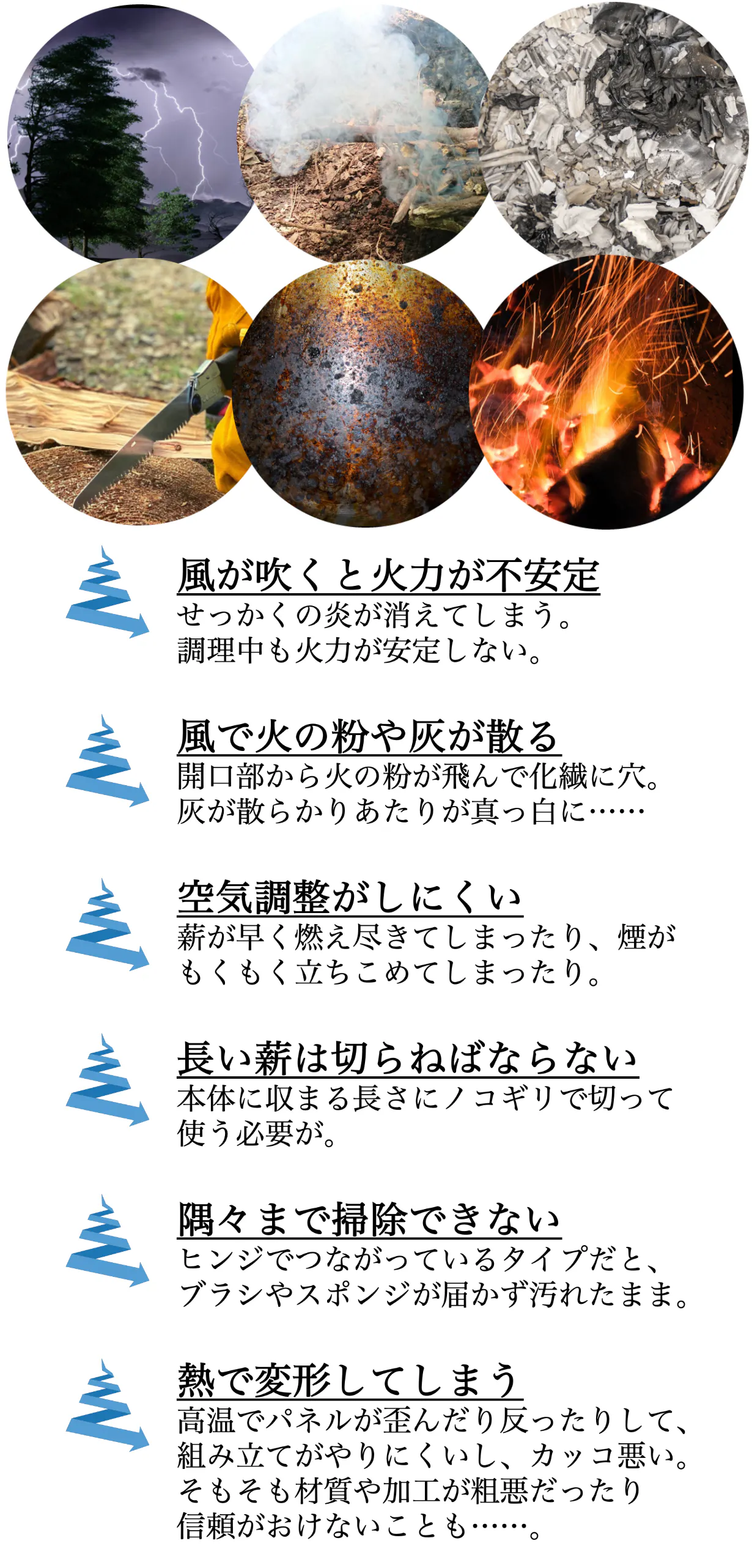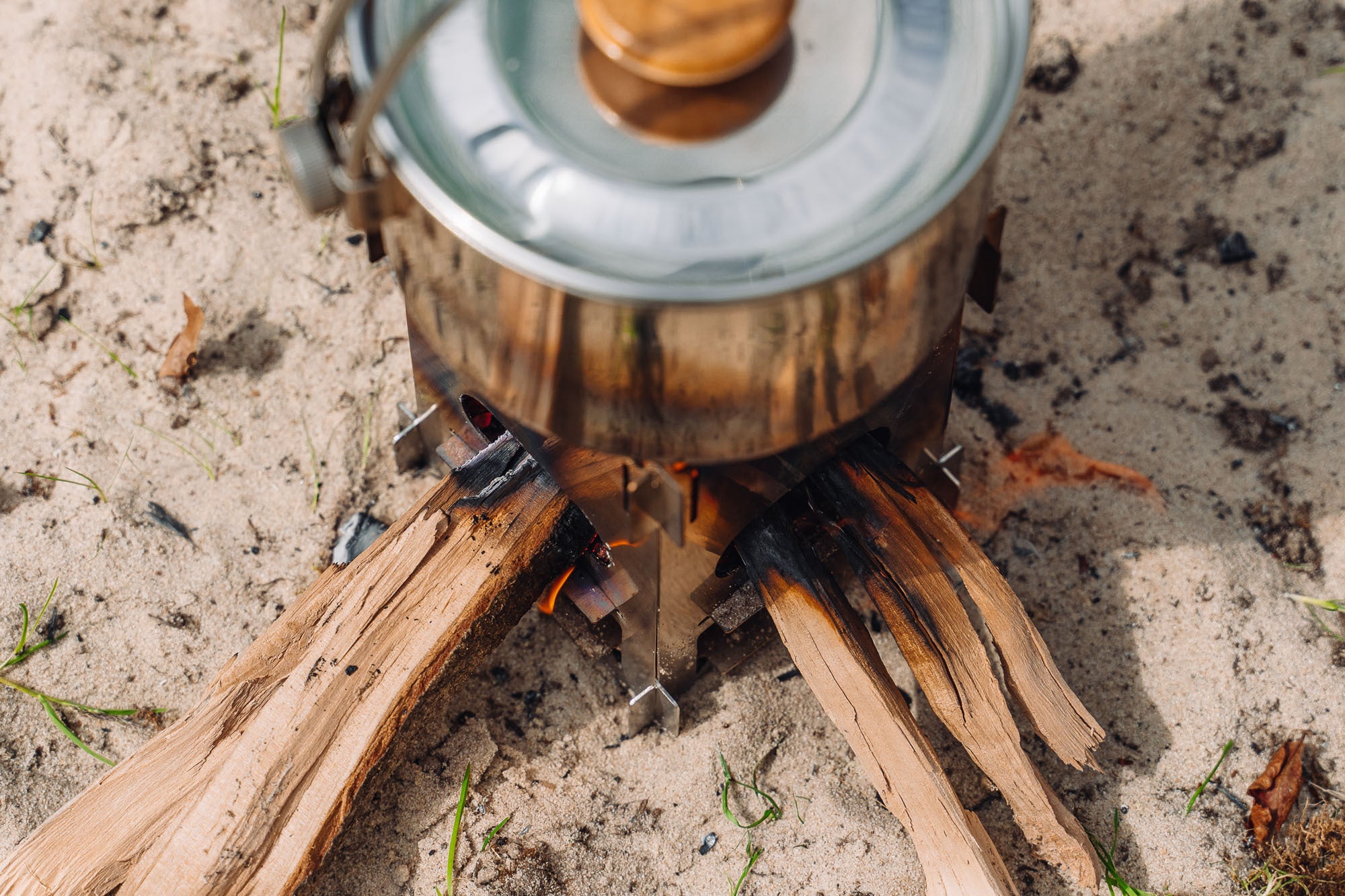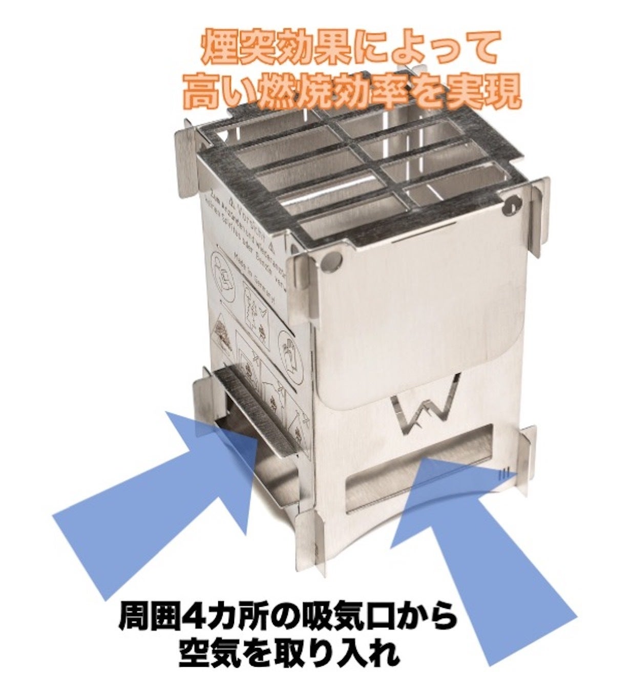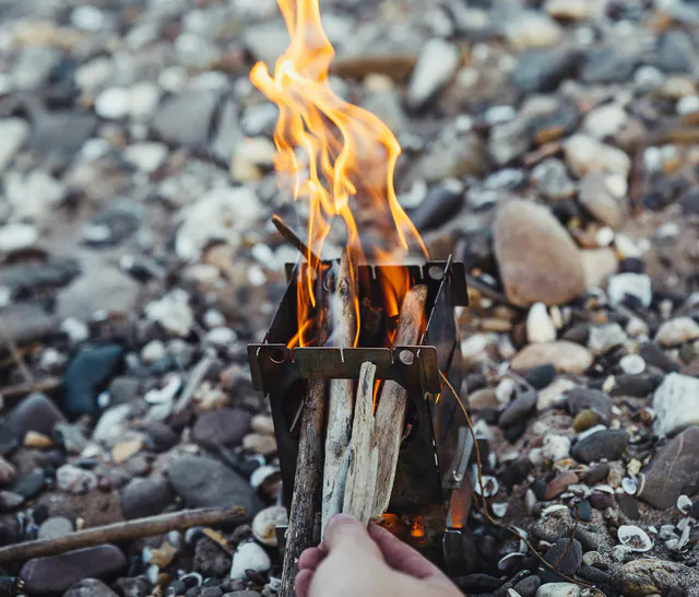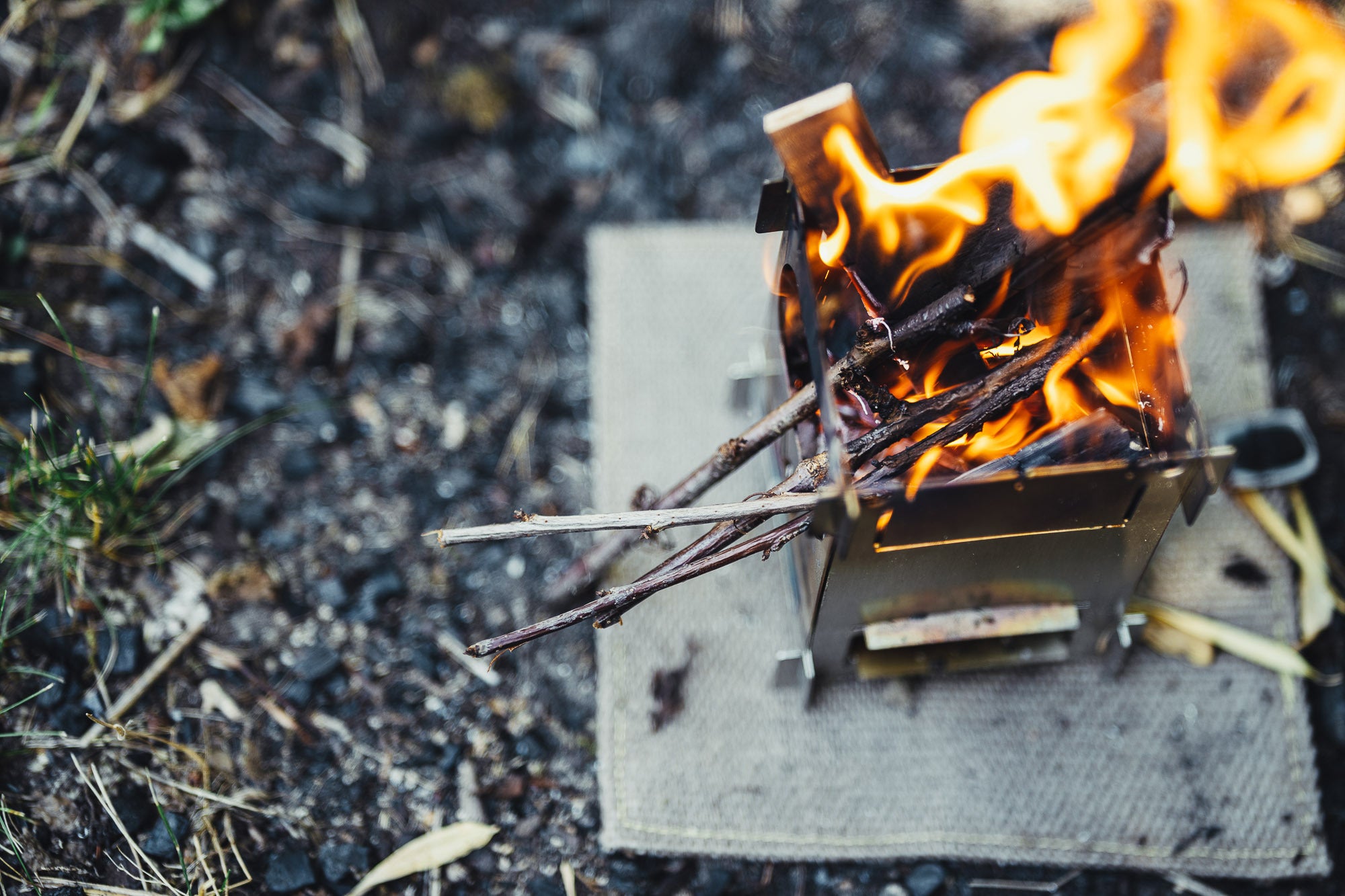 枯枝や市販の薪、アルコールストーブ、炭、固形燃料、木質ペレット、分離式ガスバーナーと、様々な熱源を使うことができます。