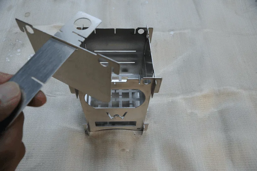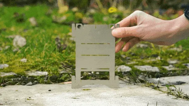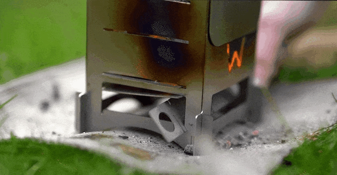 StormFireは、高さ15cm・幅と奥行き11.3cmの極小な本体。このミニマムな焚火台が炎をしっかりと保つことができるのは、風防プレートがあるからです。フロントの開口部にかぶせるだけで、吹き込む風をカット。炎は安定し、灰の飛び散りも防ぎます。