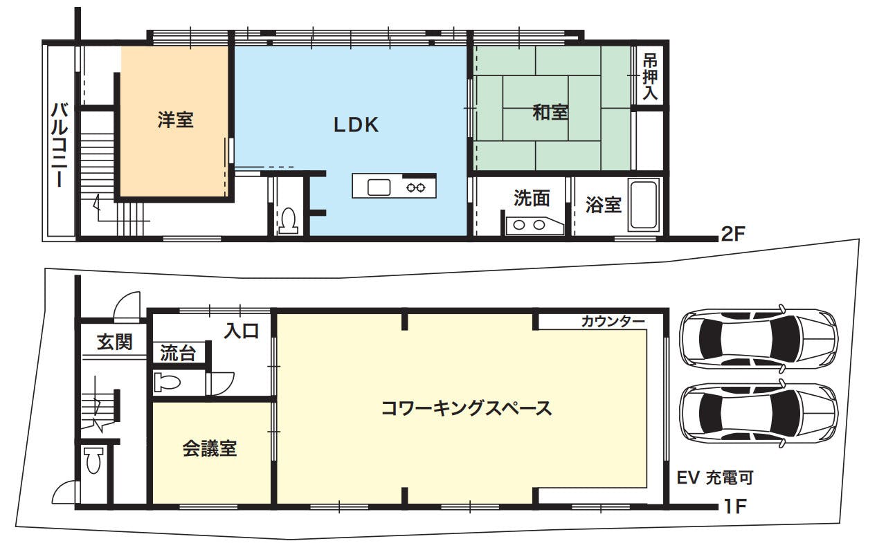 従業員向け福利厚生施設として(※福利厚生費に関しましては担当税理士様やその他専門家にご相談下さい。)、1階は利用期間中24時間利用可能なシェアオフィス(コワーキングスペース+会議室)、2階は完全プライベート宿泊スペース。