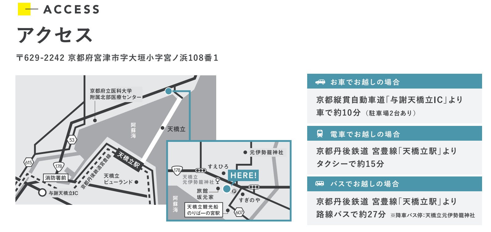 天橋立観光船乗り場「一の宮駅」まで50mと、天橋立の観光を楽しむにも最適のロケーションです。