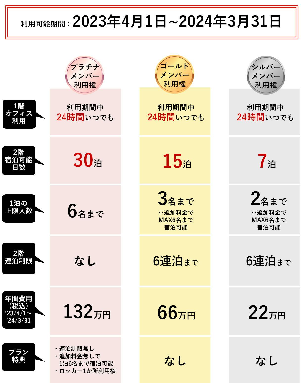 ・2階宿泊利用:メンバー利用権プランにより、年間上限宿泊可能日数が異なります(利用前予約要)