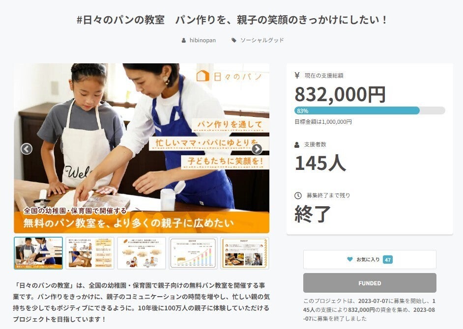 先日、日々のパンのクラファンが終了しました。たくさんのご支援、シェアなどの告知、ありがとうございました。私たち日々のパンの活動を多くの方に知ってもらいたい思いで、クラファンに挑戦しました。多くの方にご支援いただき、本当にありがとうございました。1ヶ月で『145名』の方にご支援いただきました。PV数も見ていました。最後2日は1日に1500 PVをこえ、本当に嬉しく思っています。日々のパンは、昨年7月に立ち上がったばかりのまだヨチヨチ歩きの活動です。これから皆様の応援を受けて少しずつ前に進めるようがんばっていきます。スポンサー様、会場となる幼稚園・保育園様、そして講師たち。やることいっぱいだー!!!しっかりひとつひとつがんばっていきます。焦らず、みんなとこの活動を信じて、ゆっくりと育てていきます。