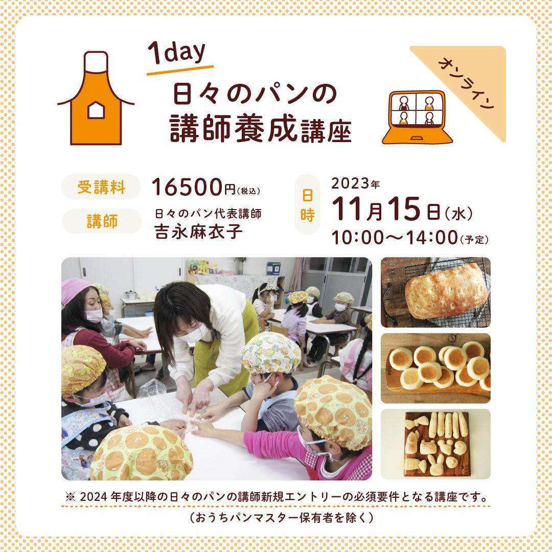 1day日々のパンの講師養成講座は2023年度内に合計5回開催しますので、いずれか1回を受講し修了してください。