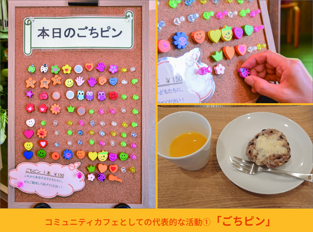 「ごちピン」とは、飲食代金にごちピン代150円をプラスしてお支払いいただくと、その分が、15:30~来店する子ども達の軽食となるシステムです。お支払い頂いた「ごちピン」は店内に設置してあるコルクボードに刺して、掲示しています。