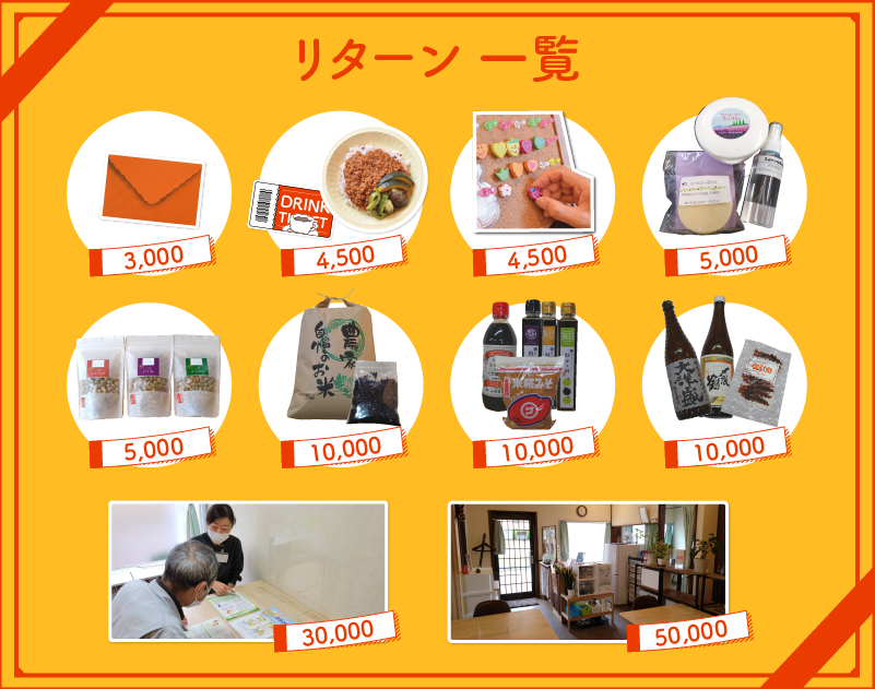 今回ご支援いただきますみなさまに、ご支援金額ごとに返礼品をご用意させていただきました。
