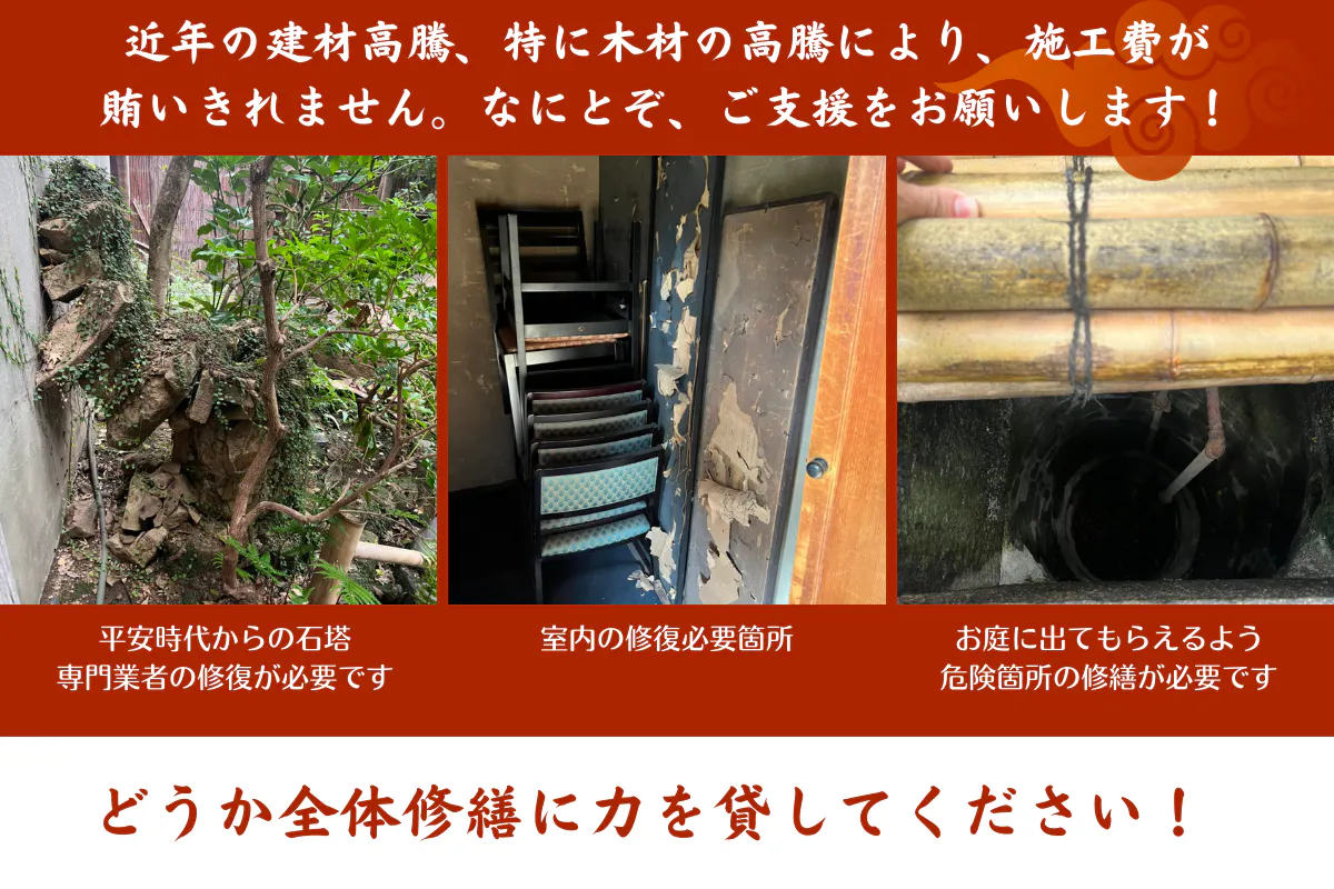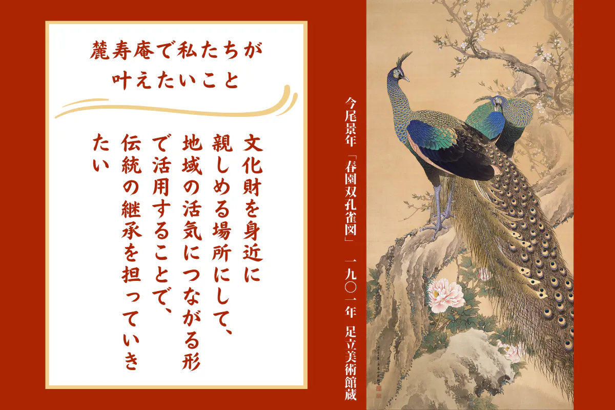 久保家住宅(旧今尾景年家住宅)の全体修繕には、邸宅内だけでなく、庭にも降りて楽しんでもらえるよう、庭の整備も含まれています。一般的な住宅設備等の建築会社ではなく、古民家再生を専門とする建築会社に修繕を依頼し、伝統ある姿はそのままに、お客様が安全に快適にくつろいで過ごせる空間にしたいと考えています。伝統的でありつつ親しめる地域遺産とするため、誰もが愛でて楽しめる場所として花わらび餅のお店「麓寿庵」をひらき、文化の継承・地域活性につなげていきたいのです。